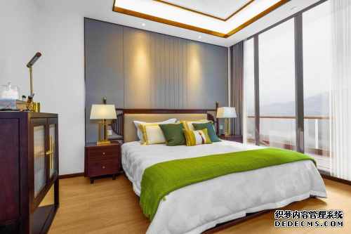 这款紫烟香阁是典型的新中式风,所配家具为高档金丝檀木家具,整体大气内敛又不失时尚,非常适合面积不算小的大两居。客厅的装修布局中正、大气、开敞,中庭吊顶与家具相呼应,极具大宅之气。