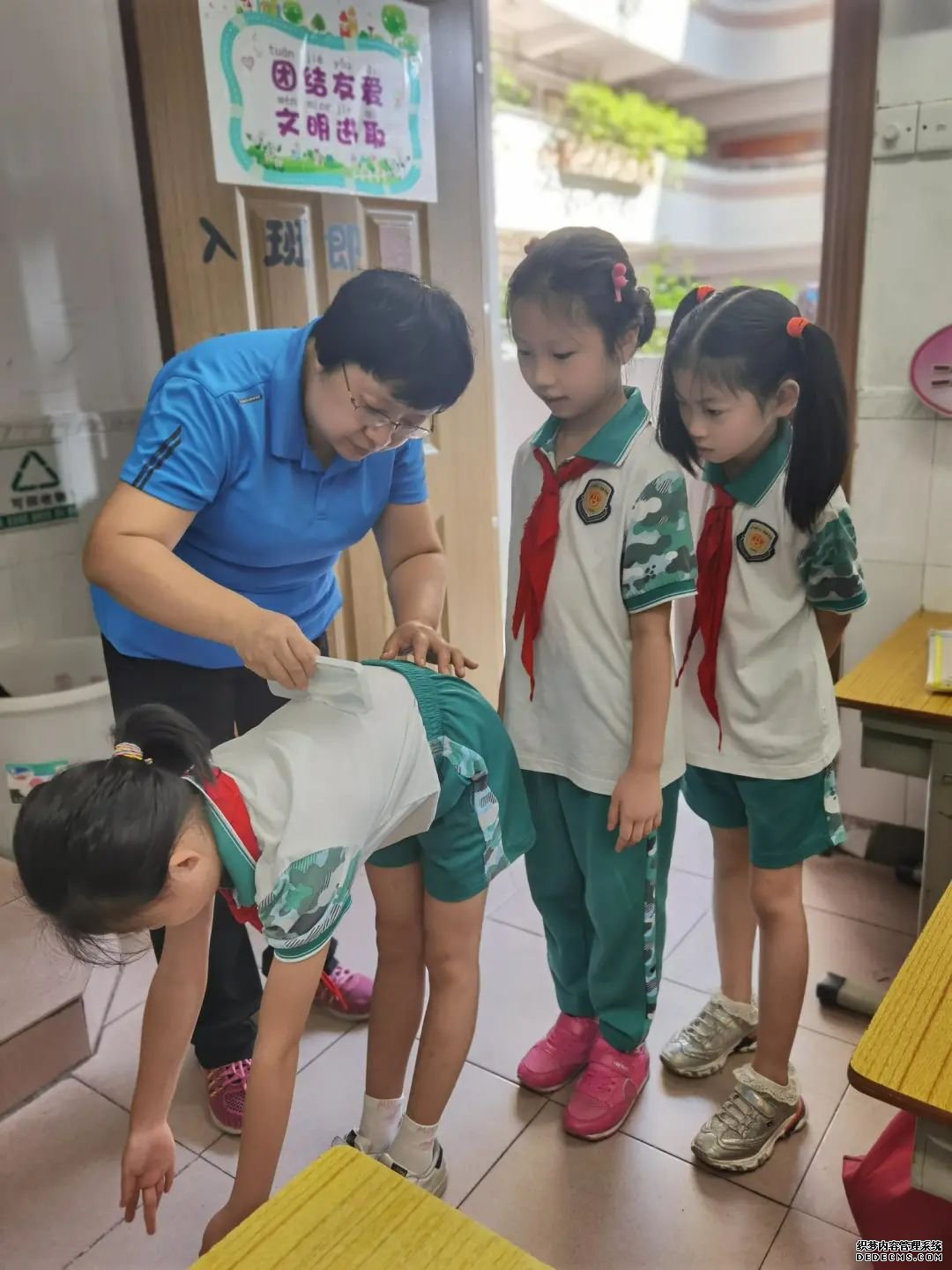 李静在班中为学生进行使用脊柱侧弯测量尺对学生进行筛查