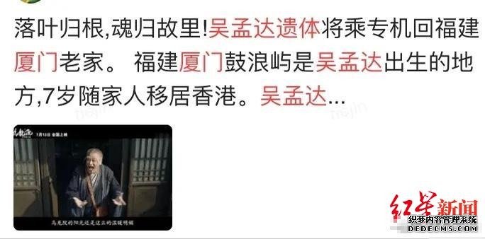 2月27日,知名喜剧演员吴孟达因病在香港逝世。消息传开,引发网友和圈内人士的集体怀念。近日,网传吴孟达的遗体将被运回福建厦门,3月1日,红星新闻记者向吴孟达好友田启文求证此事,他表示:“假的,没有这回事。”
