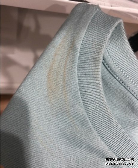 ▲记者在一件110尺码的白色童装领口看到明显的棕色污渍