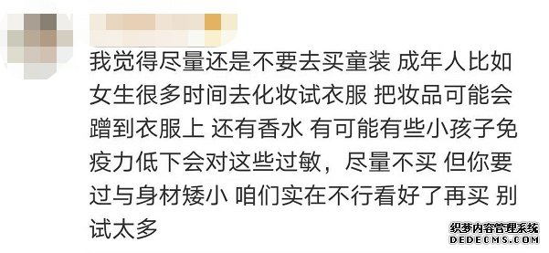 近期大量网友在评论区回复称成人试穿童装“化妆品污染童装”、“大人撑坏童装”,在看到质疑后部分博主删除自己试穿童装的照片,还有部分博主称自己试过的衣服都已购买。
