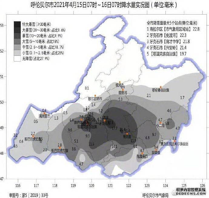 4月15日7点到16日7点,内蒙古呼伦贝尔市遭遇强降雪天气。呼伦贝尔市气象部门80个称重降水监测站共58个站有降雪,其中,大暴雪(20~29.9毫米)4个站,暴雪(10~19.9毫米)12个站,大雪(5~9.9毫米)14个站,中雪(2.5~4.9毫米)9个站,小雪(0.1~2.4毫米)19个站。最大降雪量出现在位于海拉尔区的呼伦贝尔市气象局区域站达到22.8毫米,最大雪深出现在海拉尔区达到24厘米。呼伦贝尔市气象局已于4月15日连续发布大风蓝色预警信号、暴雪黄色预警信号和道路结冰黄色预警信号,提醒相关部门和社会公众做好防御应对工作。