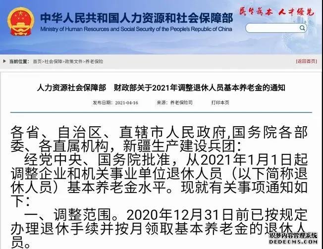 《人社部和财政部关于2021年调整退休人员基本养老金的通知》截图。