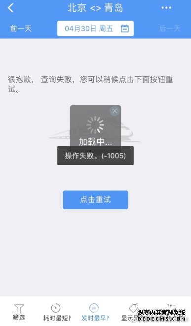 4月16日早上不到8时,郑女士就打开铁路12306官方App等着抢4月30日由北京西到重庆的火车票。没想到,等8时开票的时候,其12306账号却怎么也登不上去,“我一直点但一直出现‘请求超时,请稍后再试’的情况,查询列车情况的时候也一直加载不出来,显示‘操作失败’。”郑女士说。