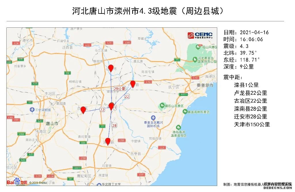 此次震中距唐山市47公里