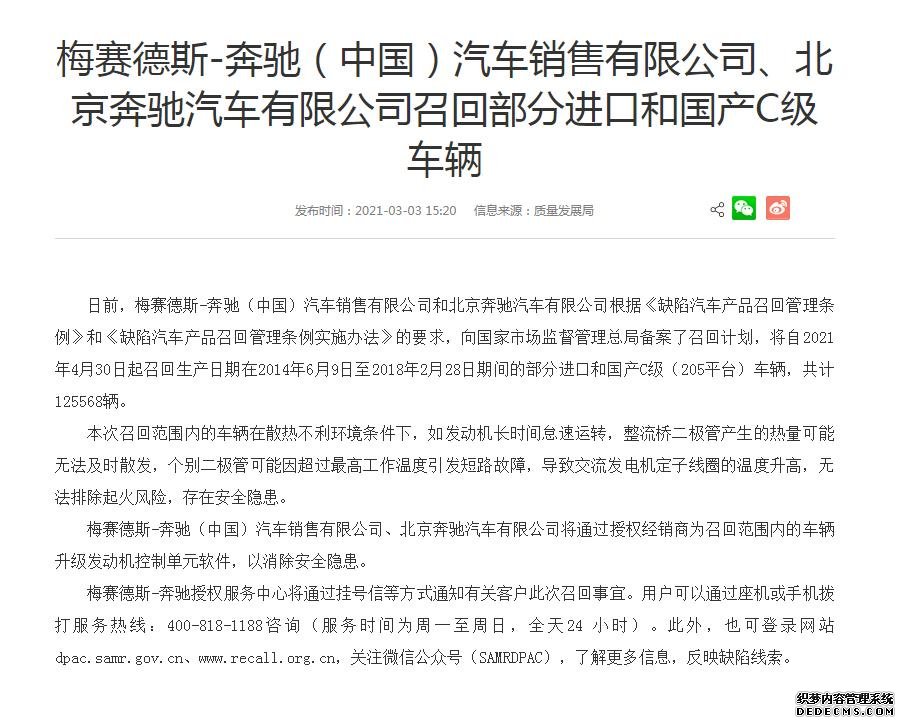 http://news.sznews.com/pic/2021-03/05/97326e7c-84f9-409c-9d34-75bcf216f412.jpghttp://www.sznews.com/news/content/2021-03/05/content_24019958.htmhttp://www.sznews.com/news/content/mb/2021-03/05/content_24019958.htm中国新闻网日前,梅赛德斯-奔驰(中国)汽车销售有限公司和北京奔驰汽车有限公司宣布自2021年4月30日起召回生产日期在2014年6月9日至2018年2月28日期间的部分进口和国产C级(205平台)车辆,共计125568辆。1/enpproperty-->
