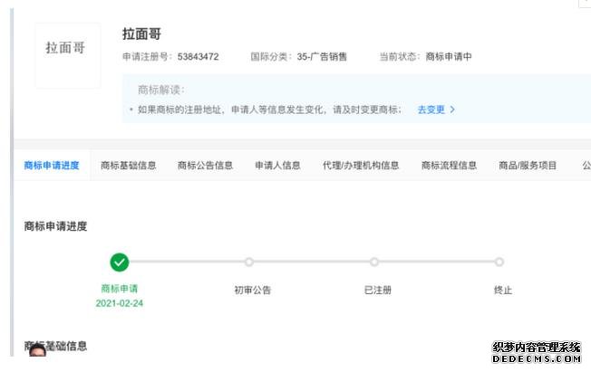 天眼查信息显示,有公司正在申请“拉面哥”商标。 来源:天眼查官网