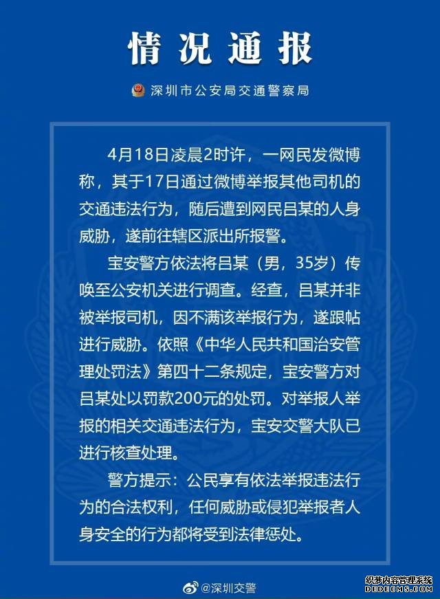 南方网2021年4月19日讯 4月18日凌晨2时许,一网民发微博称,其于17日通过微博举报其他司机的交通违法行为,随后遭到网民吕某的人身威胁。19日凌晨,深圳警方通报,威胁者吕某(男,35岁)并非被举报司机,因不满该举报行为,遂跟帖进行威胁。目前,警方已对吕某处以罚款200元的处罚。