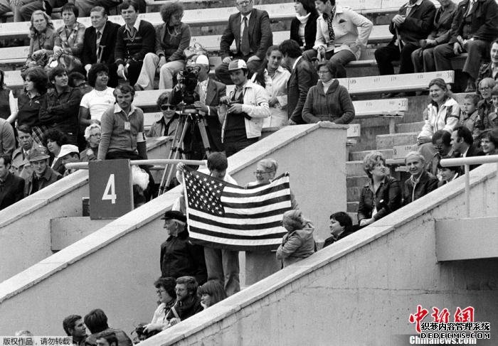 为了抗议1979年12月苏联入侵阿富汗,以美国为首的许多国家联合抵制了莫斯科奥运会。图为莫斯科奥运会开幕式上几名观众在看台上高举美国国旗。
