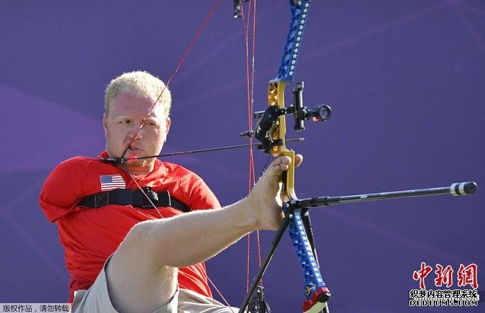 当地时间2012年9月3日,美国选手马特-斯塔兹曼参加伦敦残奥会男子射箭比赛。