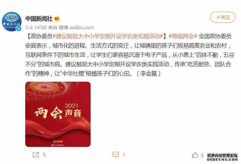 全国政协委员安庭表示,城市化的进程、生活方式的变迁,让城镇里的孩子们极易疏离农业和农村,互联网条件下的城市生活,让学生们更容易沉溺于电子产品,从小患上“四体不勤,五谷不分”的城市病。建议鼓励大中小学定期开设学农类实践活动,传承“吃苦耐劳、团队合作”的精神,让“中华社稷”根植孩子们的心田。