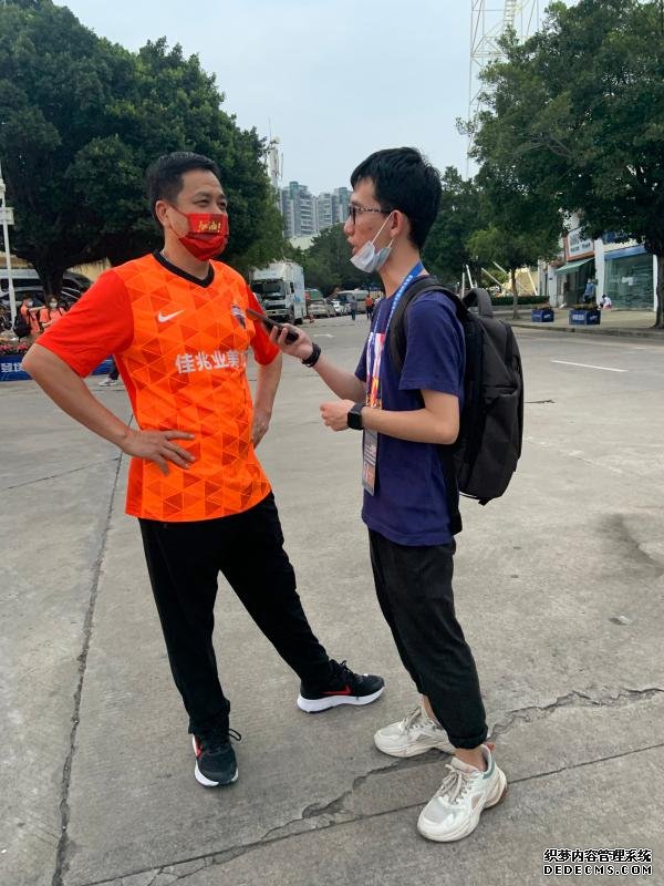 图为4月21日的深足比赛前,老陈接受采访,被拍下了这个火爆的视频。阿简摄。