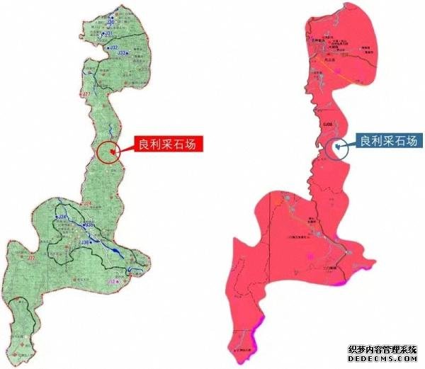 左侧为2010年批复的《公园规划》中地质公园边界图,良利采石场位于边界内;右侧为2018年出台的《凤山县矿产资源总体规划(2016-2020年》附图,将良利采石场调出公园范围。