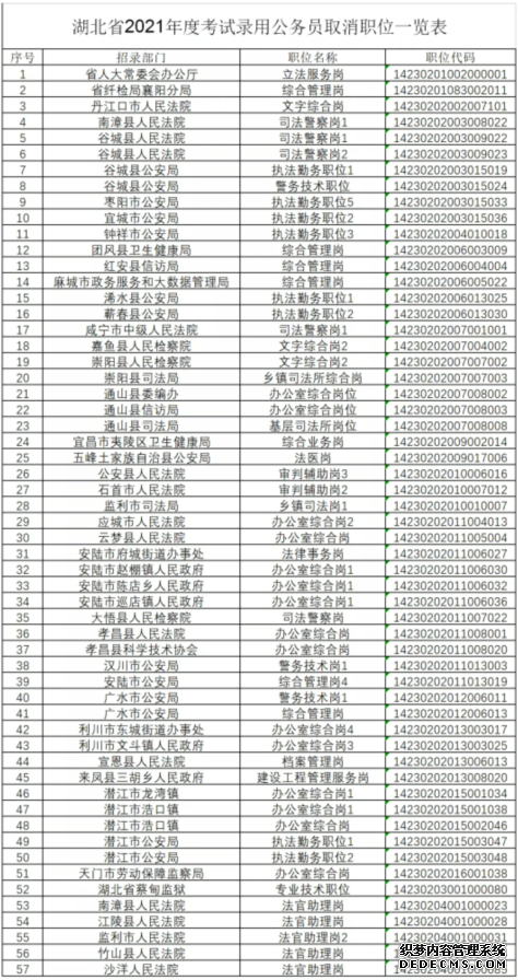 据湖北发布微信公号7日消息,湖北省公务员局近日发布消息,根据《湖北省2021年度省市县乡考试录用公务员公告》有关规定和报名缴费情况,全省共有57个职位因报名缴费确认人数不足3人予以取消。