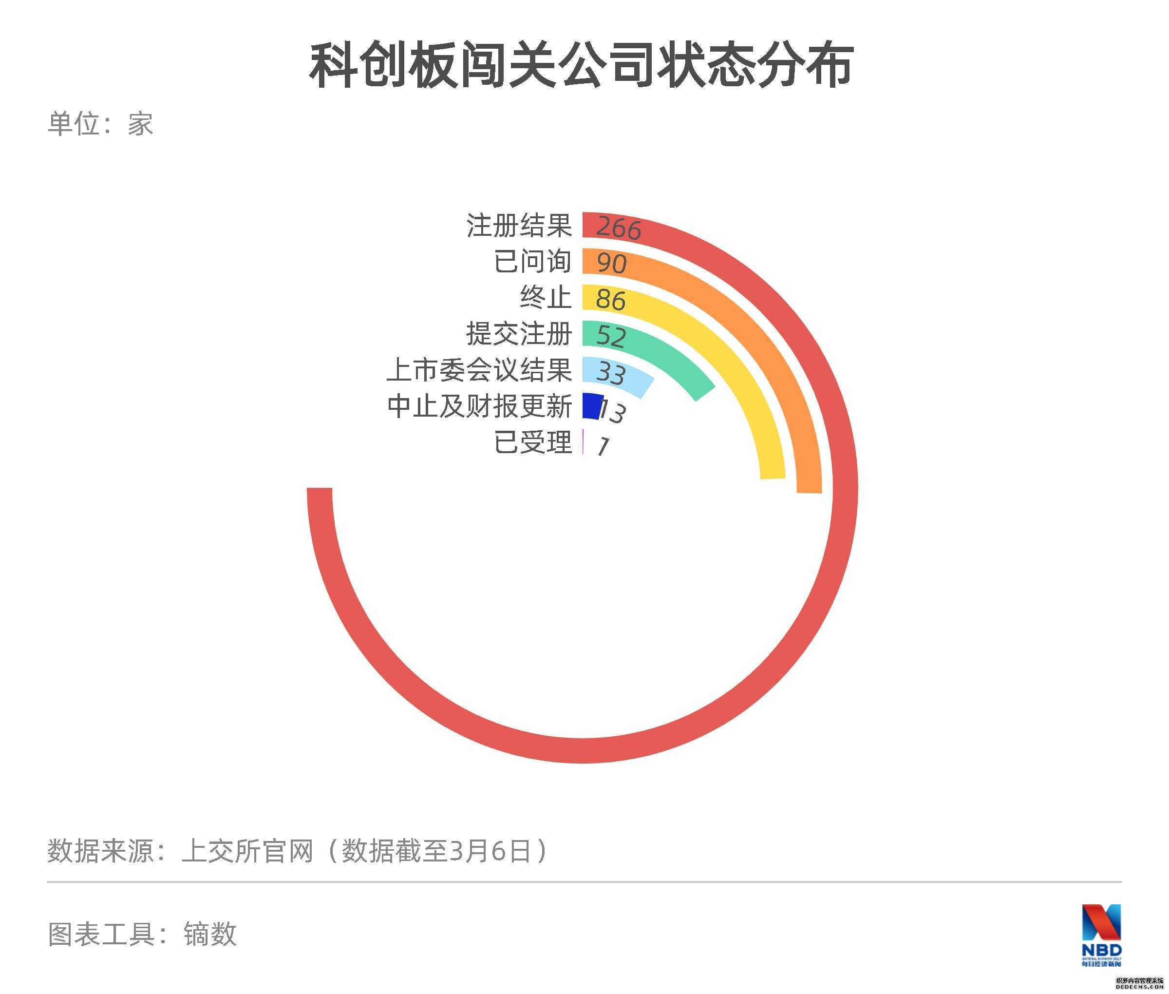 截至3月6日,科创板审核信息披露,全部541家公司中,处于“注册结果”的有266家,紧随其后的是“已问询”90家,“终止”的有86家。