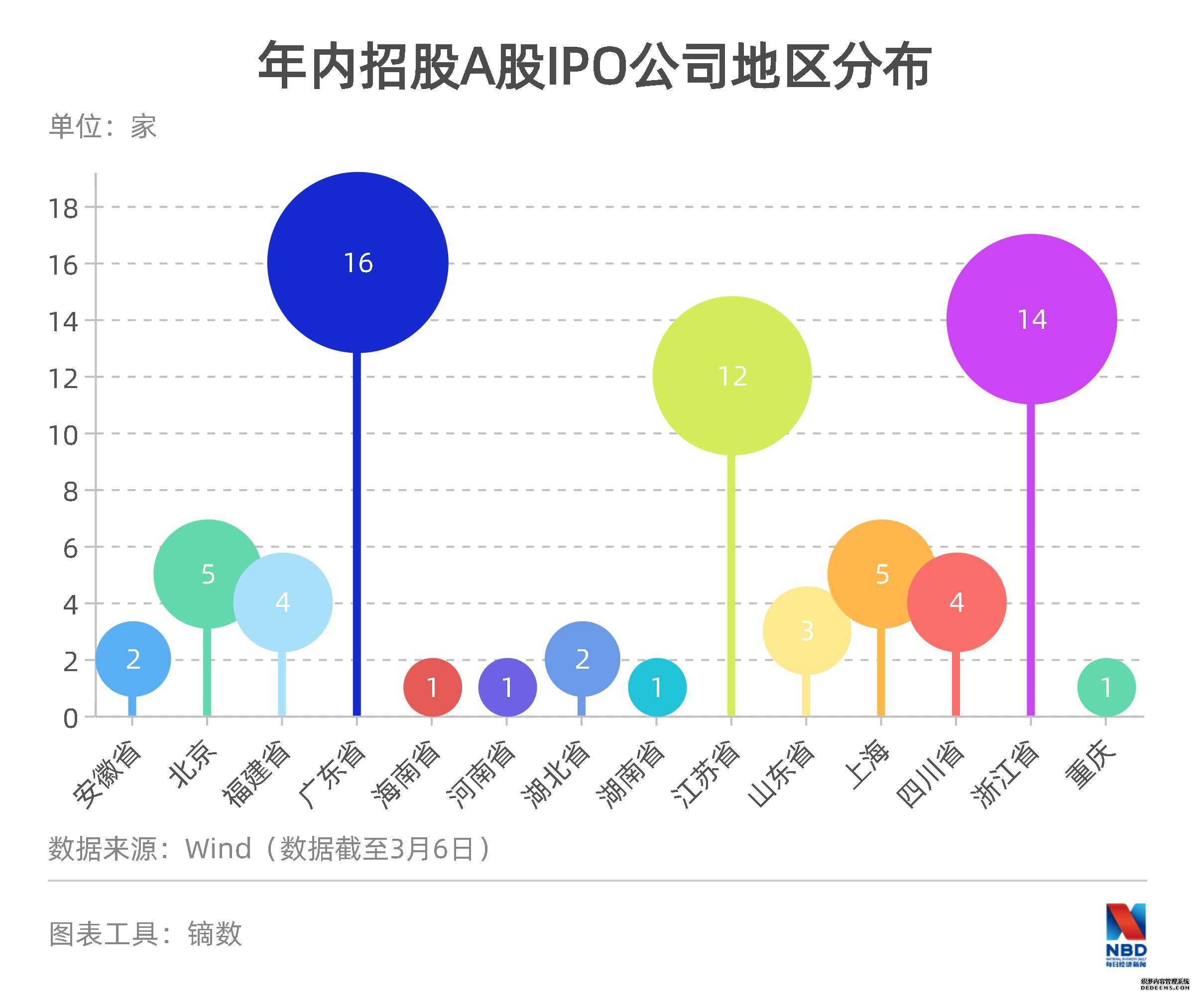 截至3月6日,年内已经有71家A股公司完成招股。从地区分布看,广东、浙江、江苏分别以16家、14家和12家名列前三甲,由此也成为大赢家。