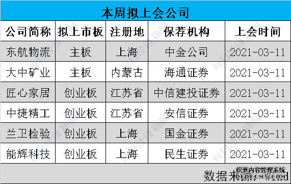 3月11日,将有6家公司上会,包括拟上创业板的匠心家居、中捷精工、兰卫检验和能辉科技,以及拟上主板的东航物流和大中矿业。