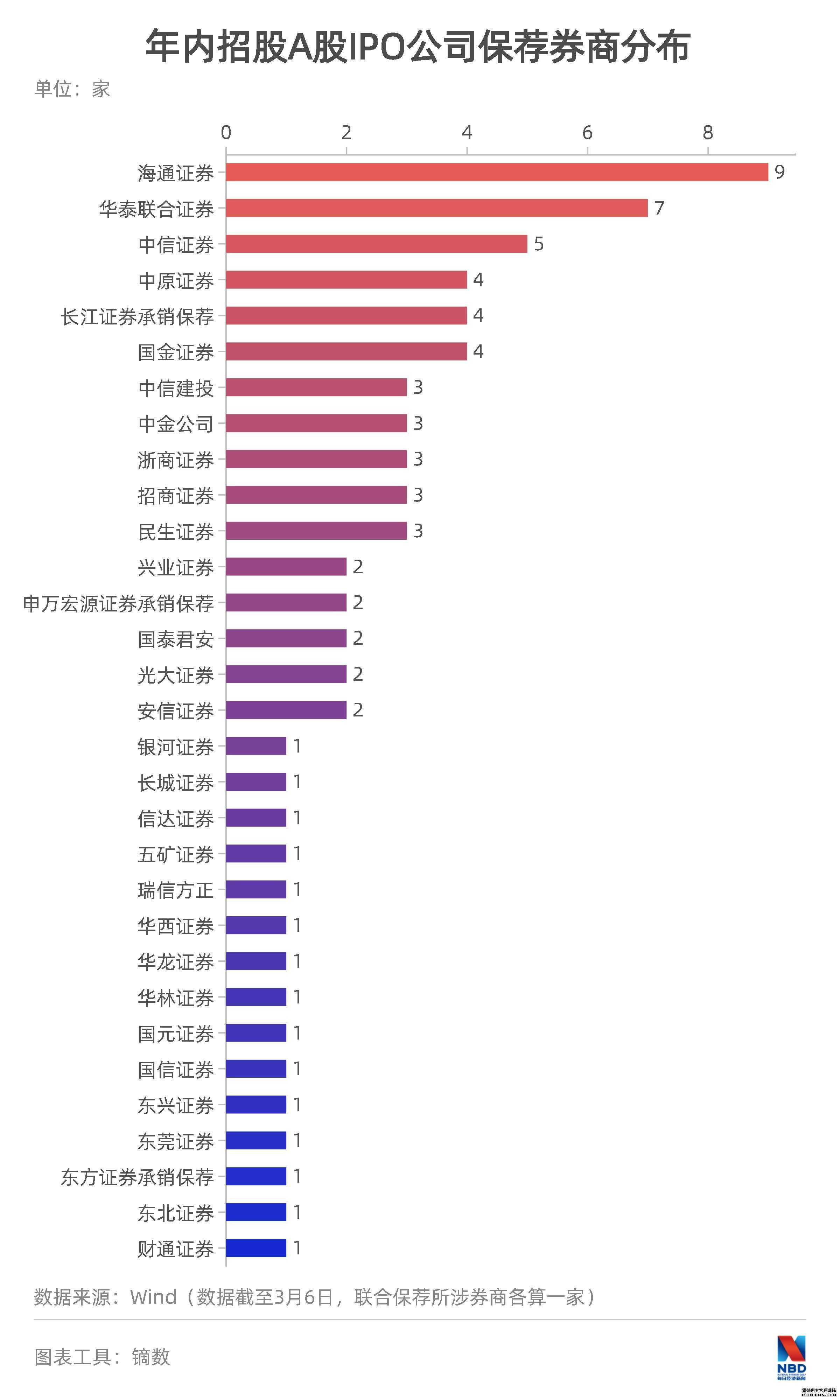 71家年内招股的A股公司中,海通证券独揽9家,据榜首位置,紧随其后的是华泰联合证券、中信证券。