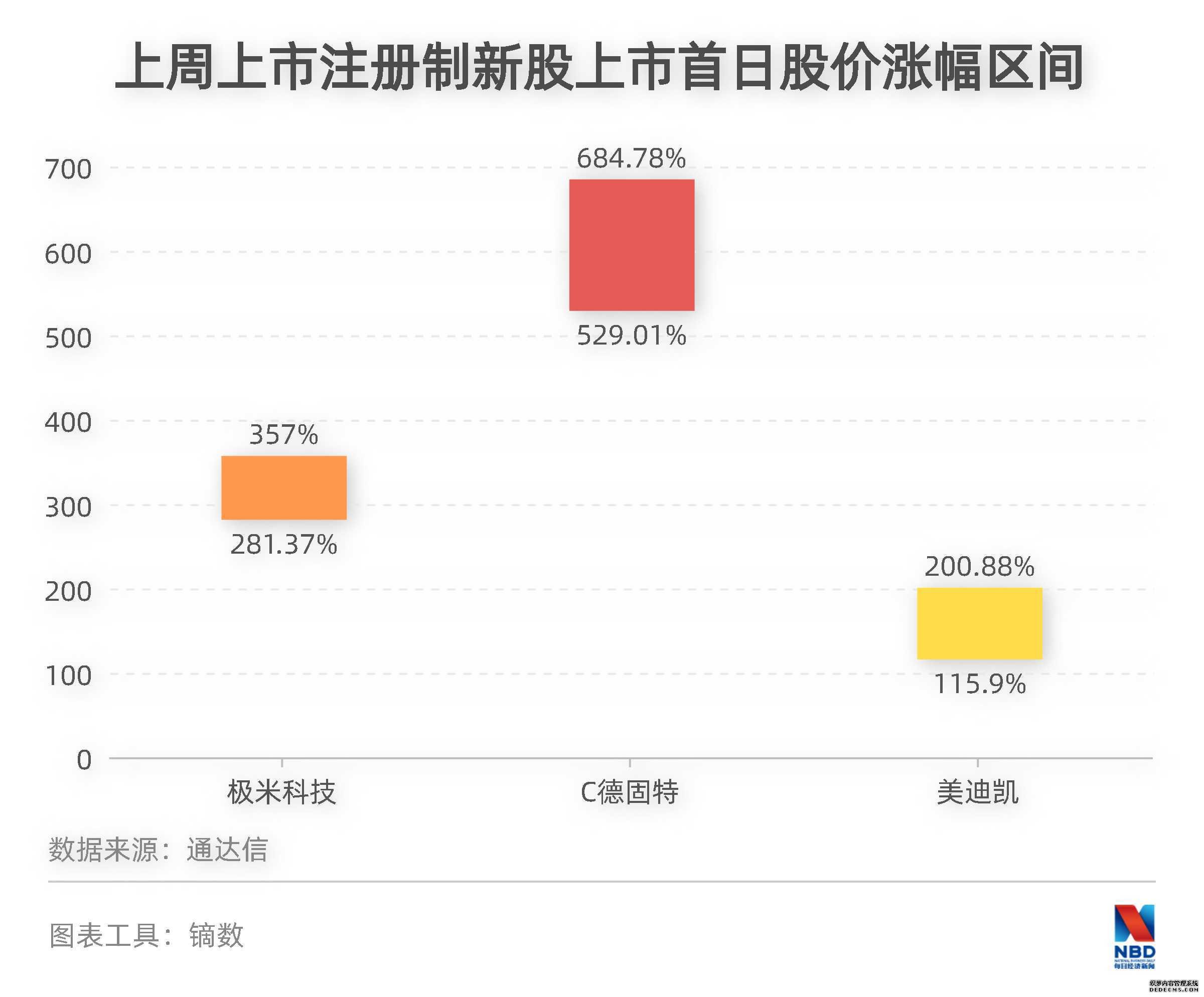 从注册制新股上市首日的股价表现看,C德固特最佳,股价涨幅区间为529.01%~684.78%。