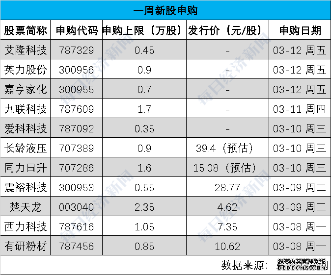 3月8日~3月12日,A股有同力日升、有研粉材等11只个股迎来申购。《每日经济新闻》记者注意到,长龄液压的发行价高达39.4元/股(预估)。