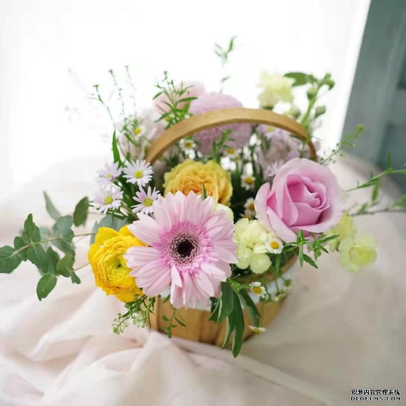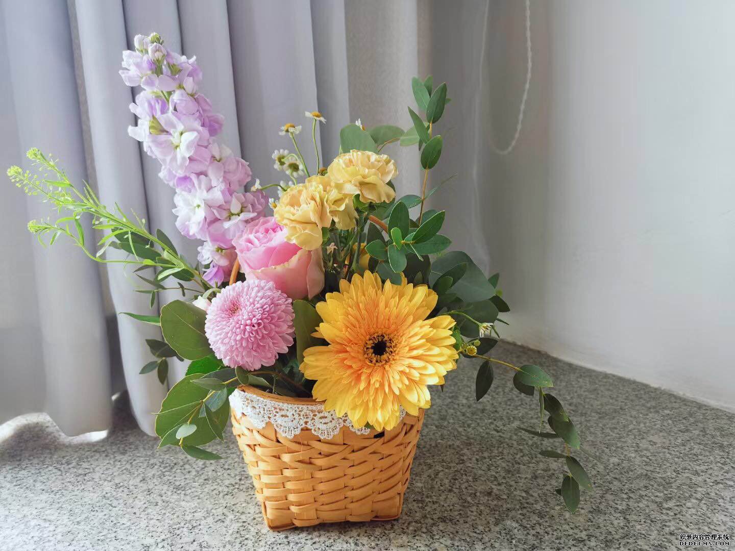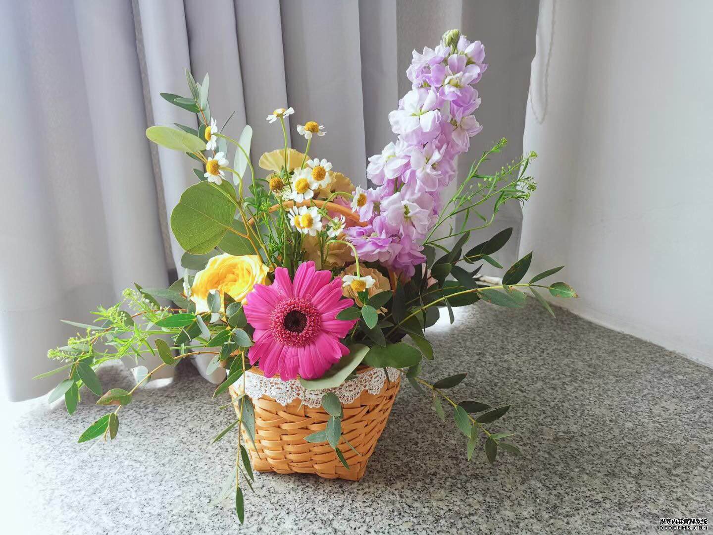 在一双双巧手下,由黄玫瑰、太阳花、粉康乃馨、乒乓菊等组成的漂亮花艺作品诞生了。