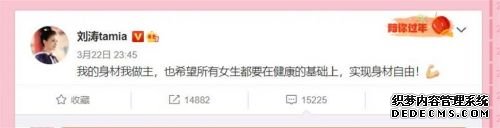 刘涛在新戏从15岁少女”刘娥”开始演起,但42岁刘涛却因此挨酸是在装嫩,就连她的沐浴戏也惨遭指身材太胖、肩膀太宽、胳膊太粗,连手也遭评没有纤纤玉手的美感,刘涛的新戏被酸得一塌糊涂,对此,刘涛昨(22日)深夜则在微博霸气回应:”我的身材我做主”,并喊话:”也希望所有女生都要在健康的基础上,实现身材自由!”