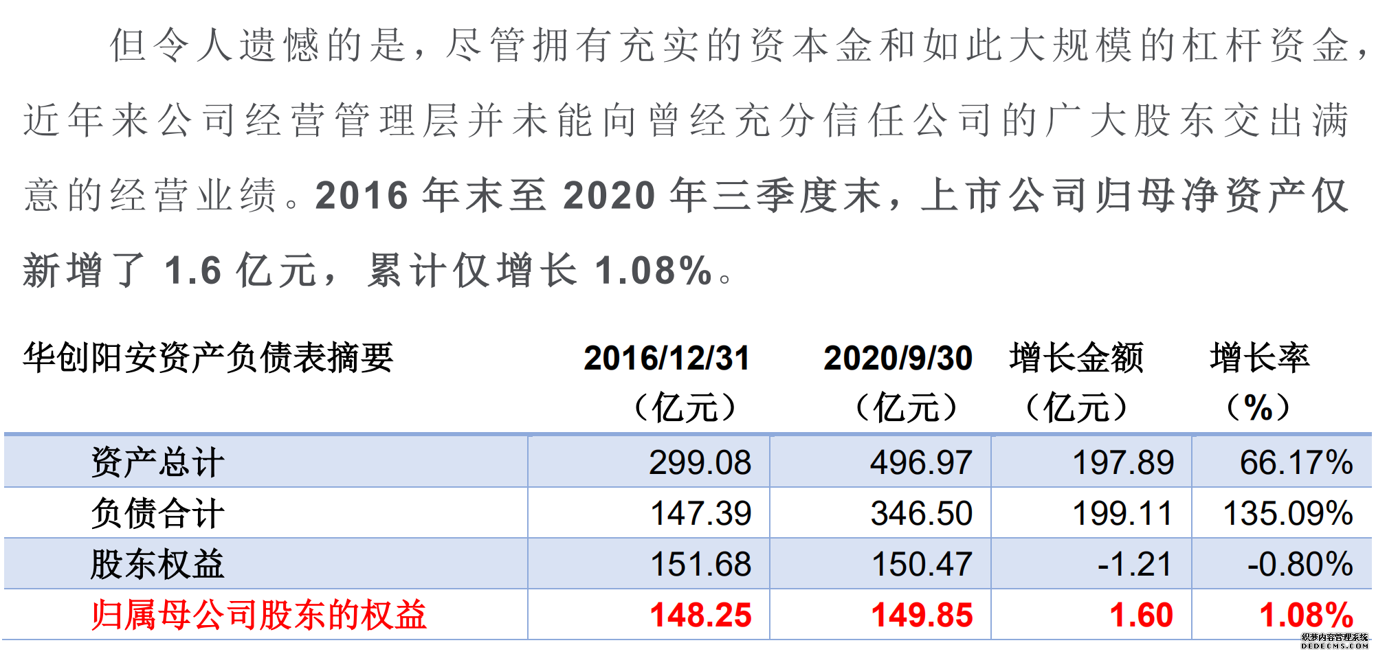 公开信内容显示,华创阳安2016年与华创证券实施重大资产重组,公司完全有能力快速发展壮大并成长为国内知名券商,但公司四年多的业绩及管理层的经营行为表明,公司经营决策水平较低,公司管理水平混乱,与股东的期许相去甚远。