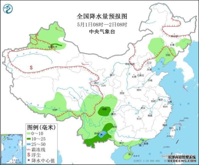 5月1日08时至2日08时,新疆北部、东北地区东南部、华南南部、西南地区大部、青藏高原东南部和海南岛等地有小到中雨,其中,云南东部局地有大雨(25~35毫米)。新疆北部、甘肃河西等地的部分地区有4~6级风。