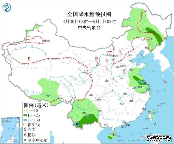 4月30日08时至5月1日08时,内蒙古东部、东北地区中部、黄淮东部、江淮大部、西南地区南部、青藏高原南部、海南岛、台湾岛东部等地有小到中雨,其中,江苏中部和云南中南部局地有大雨(25~45毫米)。新疆北部、内蒙古中西部、陕西北部、华北大部等地的部分地区有5~7级风。