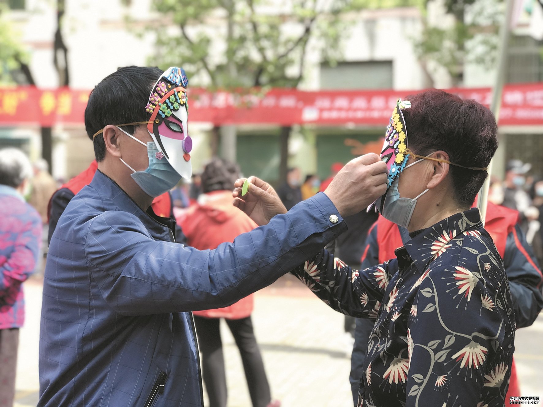 现场最受欢迎的游戏是“贴鼻子”,两个人分别戴上一个脸谱,要给对方的脸谱贴上鼻子。69岁的赵华先喊来楼下邻居王炎华,两个人戴着面具,互相给对方贴鼻子,工作人员刚说“开始”,赵华先和王炎华一下子分别给对方的脸谱贴中了鼻子,两人立马摘下面具欢呼起来。“贴中了,贴中了。”周围的街坊也为他们鼓掌,感叹两人有默契。“和邻居一起玩这个游戏,更加拉近了我们的邻里关系。”赵华先说。