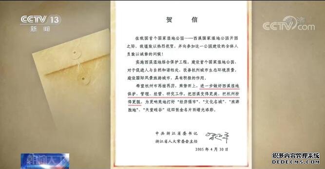 2005年4月,西溪国家湿地公园开园。时任浙江省委书记的习近平同志专门致信,希望进一步做好西溪湿地保护、管理、经营、研究工作,把西溪变得更美,把杭州扮得更靓。西溪湿地管委会一直珍藏着这封贺信。