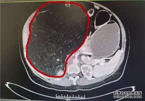 “住院之后,我们对她进行了进一步的检查,做了全腹部的增强CT。”泌尿外科徐光勇教授回忆说,CT结果显示该巨大包块最大截面约有274*192mm,来源于右肾,可能是血管平滑肌脂肪瘤。