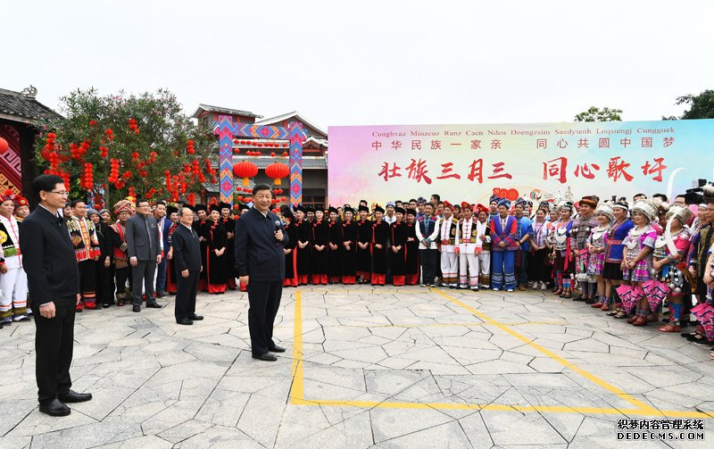 4月27日,习近平总书记在广西考察时,同广西民族博物馆外参加三月三“歌圩节”民族文化活动的各族群众亲切交流。