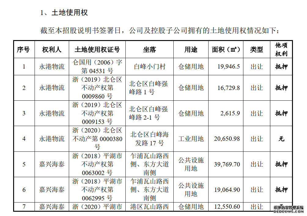 据永泰运的招股书,截至目前永港物流总计拥有4块土地的使用权。