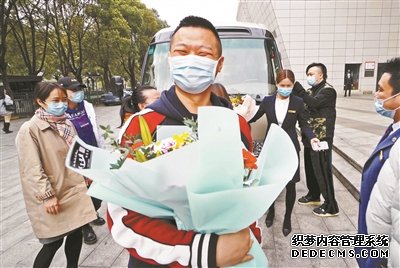 北京援鄂医疗队队员、北京宣武医院王长亮接到武汉当时驻地酒店工作人员送来的鲜花。