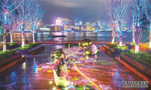在北滨大道三段新安装了情景艺术灯光,通过多层光照染色等技术,实现与周边植被和构筑物的巧妙结合。在行道树上,射灯打出或蓝或紫的背景光,星星点点的灯光闪烁游移,营造出夏夜萤火虫飞舞般的梦幻效果。音乐广场周边人行道上增加了动感旋转灯绘,投射出历代名人诗词及万州诗人何其芳的诗歌。花朵、蝴蝶在地面旋转、飞舞,活灵活现,为音乐广场增添了文艺气息,引得市民纷纷驻足观赏。