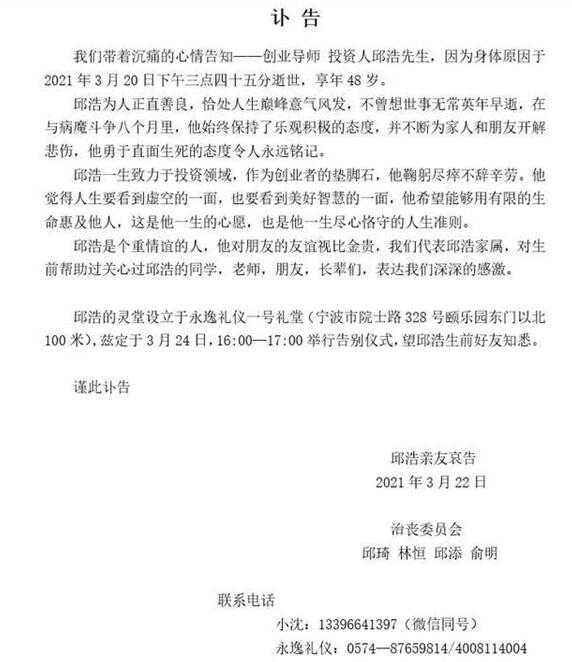 3月23日,莲花资本创始人邱浩的亲友发布讣告称,邱浩因身体原因,于2021年3月20日下午3点45分逝世,享年48岁。