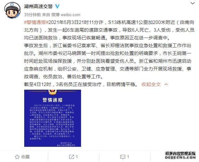 中新网5月4日电 据浙江省公安厅高速交警总队湖州支队官方微博消息,2021年5月3日21时11分许,S13练杭高速1公里加200米附近(由南向北方向),发生一起6车追尾的道路交通事故,导致6人死亡、3人受伤,受伤人员均已送医院救治,事故现场已恢复畅通。事故原因正在进一步调查中。