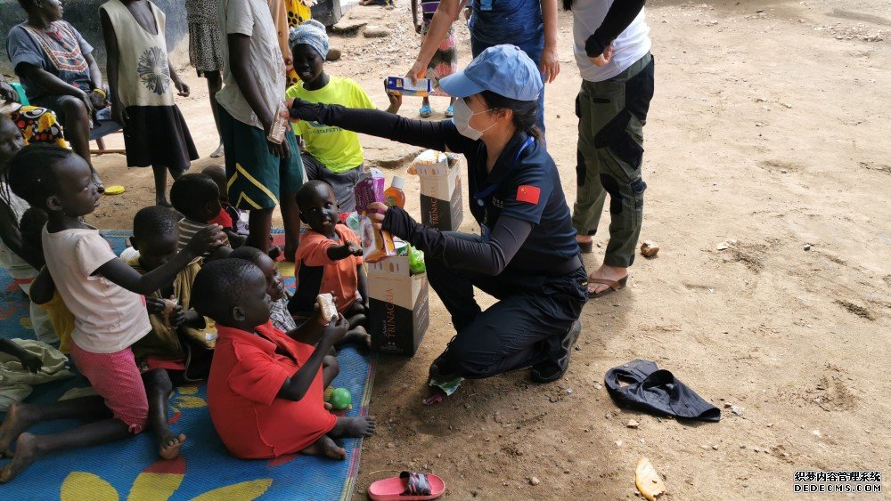 2020年10月,在南苏丹首都朱巴,维和警队队员廖洁慰问当地孤儿院的儿童。新华社发