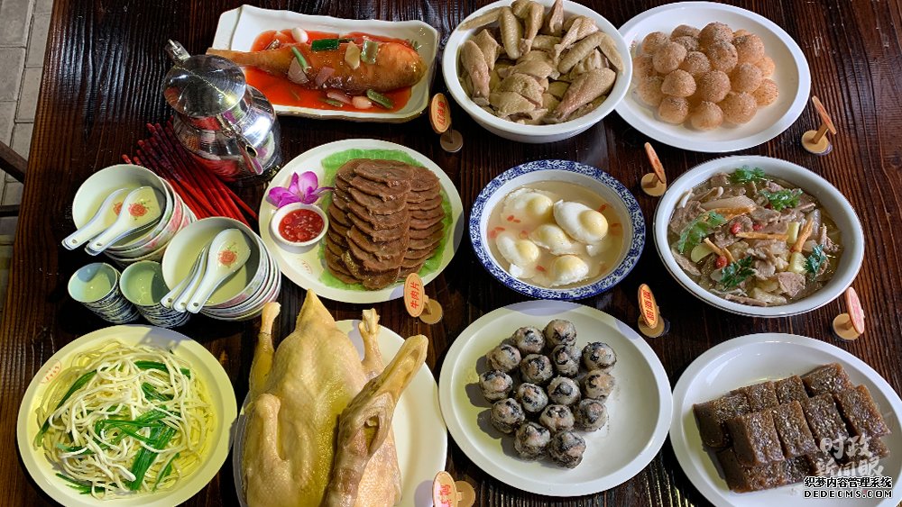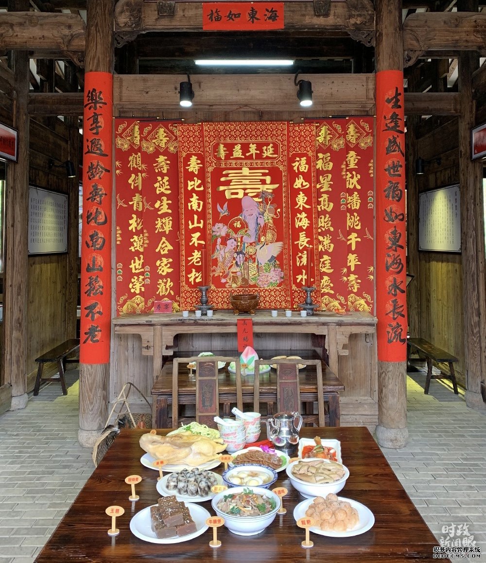 在俞邦村,习近平考察了夏茂特色小吃民俗文化馆。馆中最吸引眼球的当属这桌丰盛的寿宴。按照当地习俗,寿宴当天,大公鸡、寿饼、寿酒、寿桃、寿面、寿烛、寿炮都是必备之礼。
