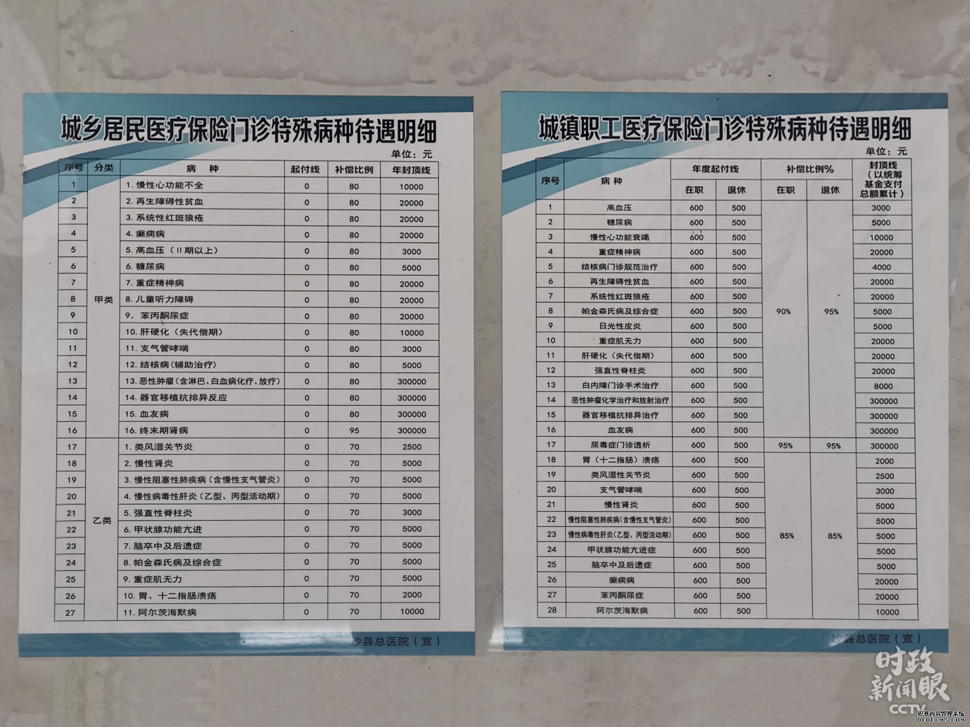 △这是当地城乡居民(左)和城镇职工(右)医疗保险门诊特殊病种待遇明细。(总台央视记者杨立峰拍摄)