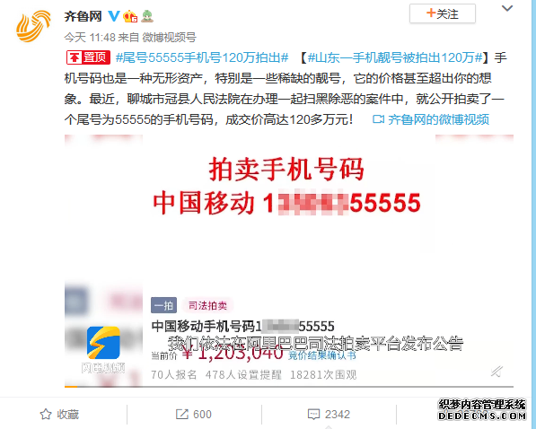 手机号码也是一种无形资产,特别是一些稀缺的靓号,它的价格甚至超出你的想象。最近,聊城市冠县人民法院在办理一起扫黑除恶的案件中,就公开拍卖了一个尾号为55555的手机号码,成交价高达120多万元!
