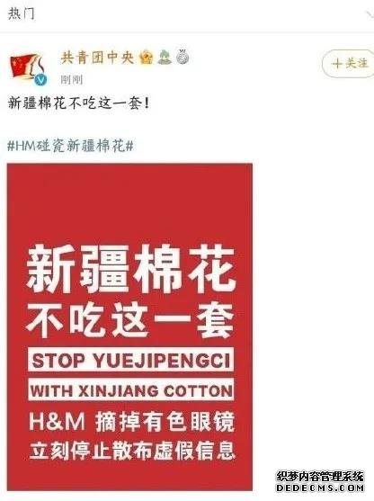 今天(24日),@共青团中央 微博发布的两条有关H&M公司#碰瓷新疆棉花#的消息引发网友广泛关注。