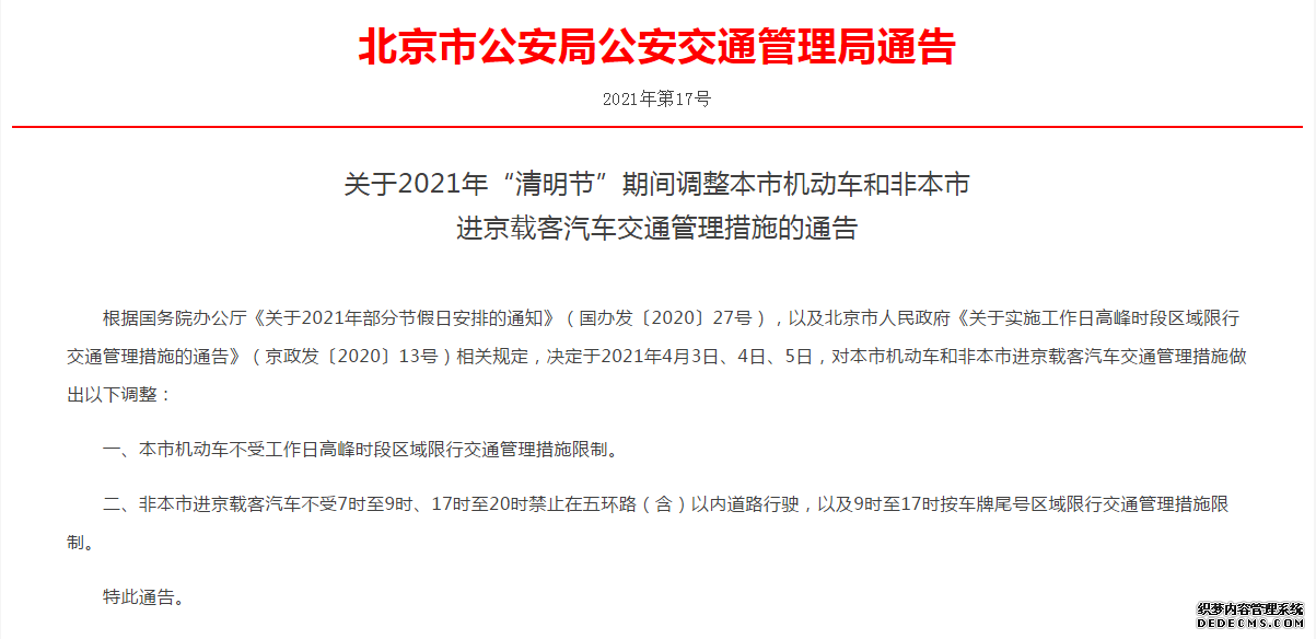 北京市公安局公安交通管理局网站通告,调整2021年“清明节”期间北京市机动车和非本市进京载客汽车交通管理措施。