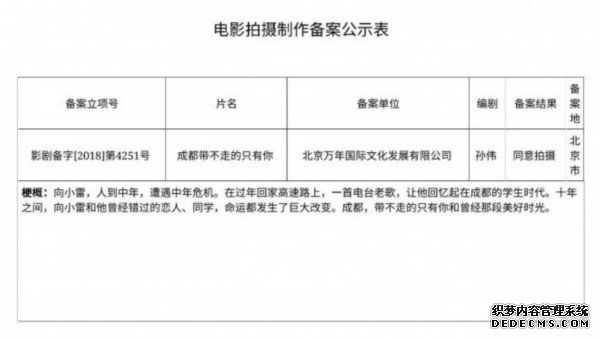 该片已于2018年在国家新闻出版广电总局备案立项,编剧为孙伟。剧情梗概如下:向小雷,人到中年,遭遇中年危机。在过年回家高速路上,一首电台老歌,让他回忆起在成都的学生时代。十年之间,向小雷和他曾经错过的恋人、同学,命运都发生了巨大改变。成都,带不走的只有你和曾经那段美好时光。