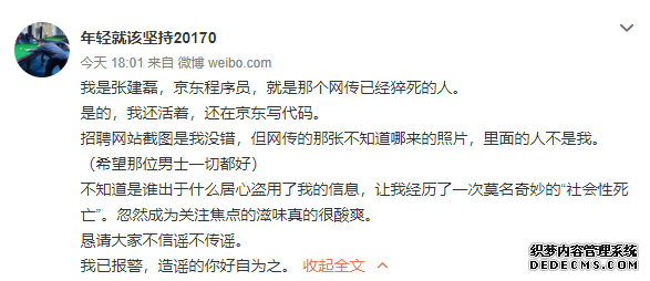(原题为《京东程序员猝死?本人回应:我还在写代码,已报警》)