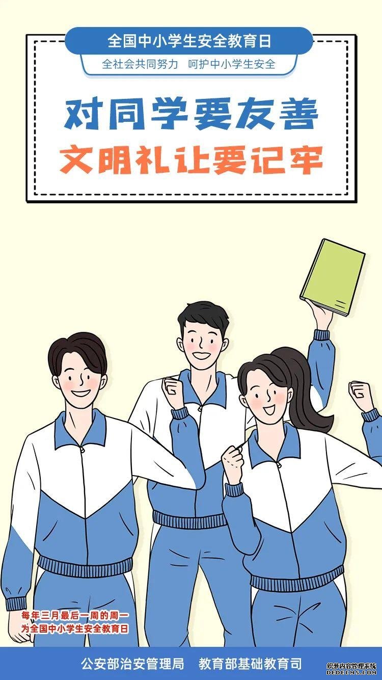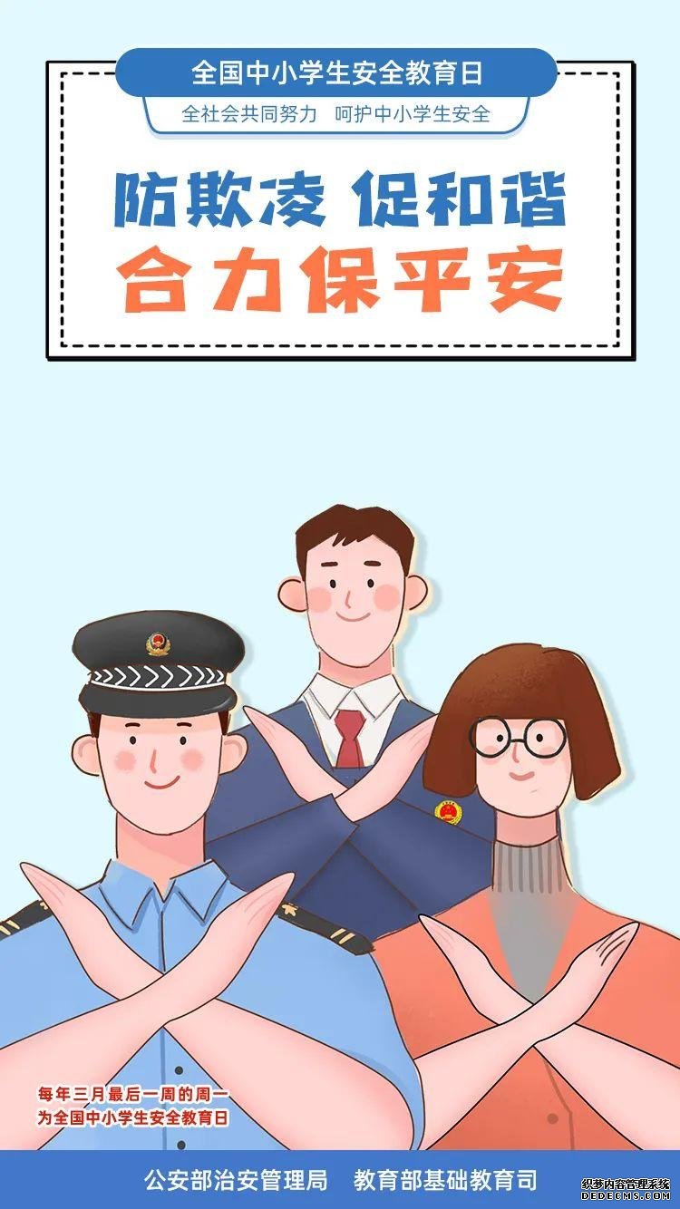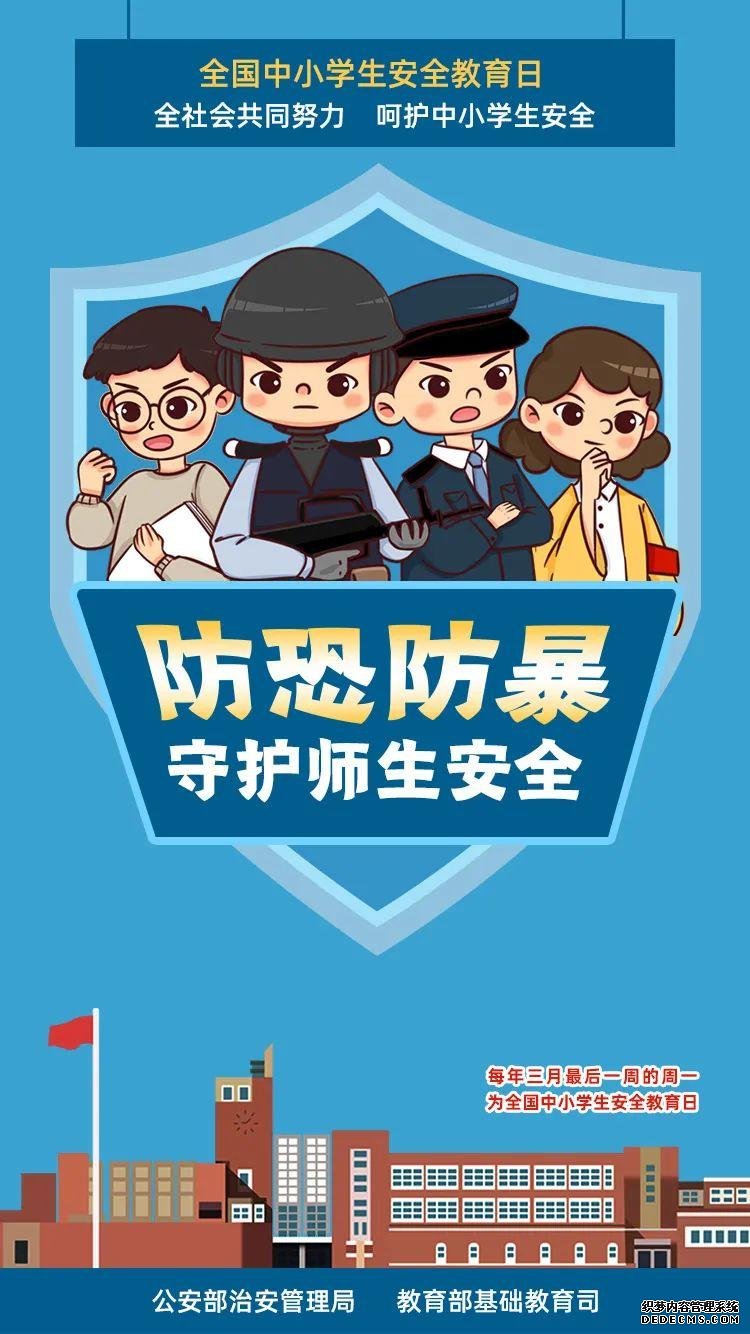 3月29日是第26个全国中小学生安全教育日。教育部日前印发通知,就今年全国中小学生安全教育日活动进行部署,要求各地各校结合实际,集中开展一次专题安全教育、组织一次应急疏散演练、开展一次国家安全教育、开展一次集中宣传活动。此外,还联合公安部制作了全国中小学生安全教育日系列海报,涵盖防恐防暴、交通安全、防欺凌、防溺水等4个方面,跟小编一起来学习——