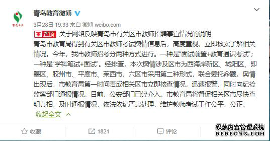 青岛市教育局发布的情况说明称,青岛市教育局得到有关区市教师考试舆情信息后,高度重视,立即核实了解相关情况。今年,本市教师招考分两种方式进行。一种是“面试前置+教育通识考试”;一种是“学科笔试+面试”。经排查,本次舆情涉及区市为西海岸新区、城阳区、即墨区、胶州市、平度市、莱西市,六区市采用第二种形式,联合委托命题。舆情出现后,市教育局第一时间责成相关区市立即核查情况,迅速报警,同时向纪检监察部门通报情况。目前,公安部门已经介入。市教育局将督促相关区市尽快查明真相,及时通报情况,依法依纪严肃处理,维护教师考试工作公平,公正。