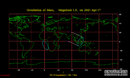 4月17日月掩火星掩食带示意图(图源:国际掩星测时组织)