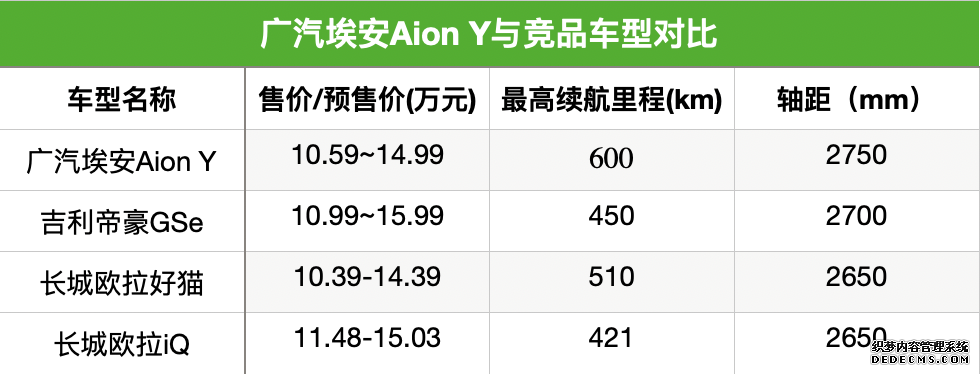 与上述纯电动车相比,Aion Y的优势在于其续航里程和车内空间。据了解,Aion Y最高续航里程可达600km,其轴距为2750mm。